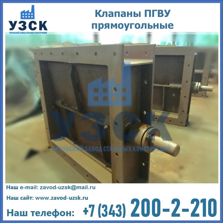 Прямоугольный клапан ПГВУ имеет прямоугольную или квадратную форму, по основному сечению конструкции, на которую устанавливается клапан. Для изготовления в Каскелене применяются сталь или чугун, в зависимости от модели. Внутри клапана имеется запорный элемент, передвигающийся параллельно общему потоку движения среды. Шибер ПГВУ имеет такую же форму, как и основное сечение. Перемещение створки происходит благодаря возвратно-поступательным движениям.