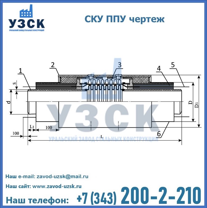 Сильфонный компенсационный узел СКУ ППУ изготавливается из патрубков, приваренных к гофре и обработанных сверху пенополиуританом. На изделие также устанавливается система дистанционного контроля (с ОДК). Устройство состоит из стальной трубы (1), футляра (2), компенсатора сильфонного осевого (3), изоляции из пенополиуретана (4), системы оперативного дистанционного контроля СОДК (5), трубы оболочки ПЭ или ОЦ (6).