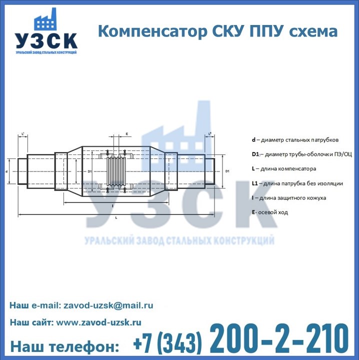 Уральский Завод Стальных Конструкций в Каскелене предлагает готовые изделия, а также вы можете приобрести компенсатор СКУ ППУ под заказ. Наш завод располагает всем необходимым оборудованием для производства нестандартных позиций компенсатора СКУ в ППУ изоляции. Завод «УЗСК» предлагает большой выбор качественных и надежных компенсаторов СКУ ППУ, полностью укомплектованных и готовых к эксплуатации. Мы гарантируем соответствие нашей продукции всем требованиям ГОСТ и ТУ, износостойкость и высокую производительность. Наше предприятие поставляет и производит оборудование, имеющее длительную гарантию и большой эксплуатационный ресурс. Если вы хотите заказать сильфонные компенсационные устройства СКУ ППУ или другое оборудование с доставкой, наши специалисты помогут рассчитать стоимость транспортных расходов и организуют доставку товара. Вы можете оформить заказ на продукцию на нашем сайте, для этого достаточно заполнить форму обратной связи.