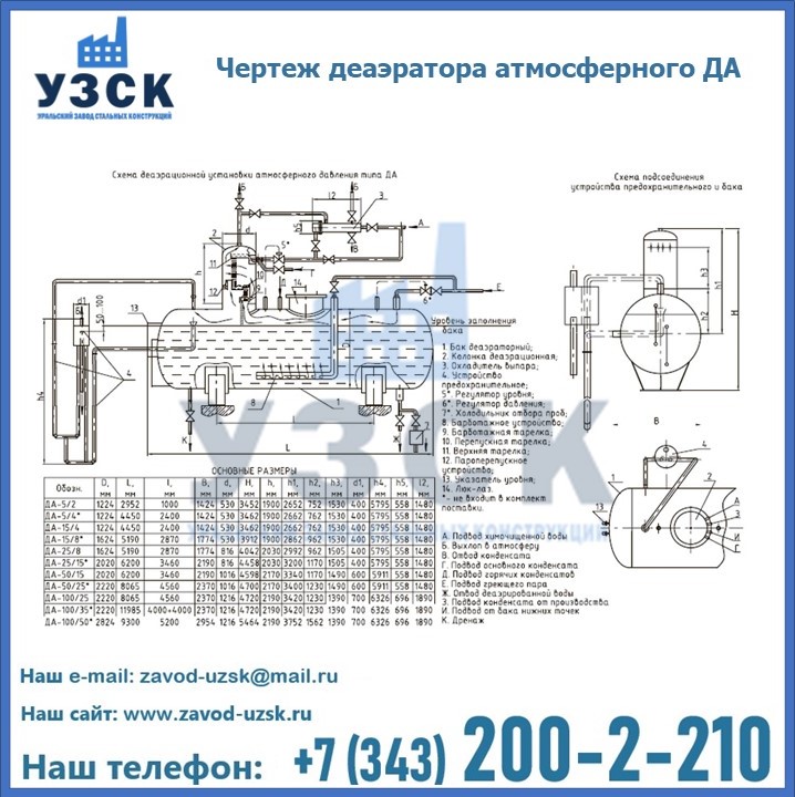 Приобрести качественное оборудование, в том числе, деаэраторы ДА, можно в компании УЗСК в Каскелене. Мы предлагаем долговечную и надежную продукцию по приемлемой цене. Заказать и купить деаэраторы или другие изделия высокого качества можно через сайт Уральского Завода Стальных Конструкций, или позвонив по указанному в разделе «Контакты» телефону.